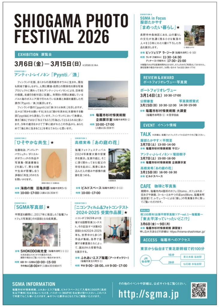 会場:海商の館 旧亀井邸(塩竈市宮町5-5) 塩竈フォトフェスティバル 公式ウェブサイト塩竈フォトフェスティバル公式ウェブサイト|SGMA Shiogama Photo Festival Official Website東北最大規模の“楽しむ”写真フェスティバル。ふれあいエスプ塩竈ほか塩竈市内各所にて、ポートフォリオ・レヴュー...